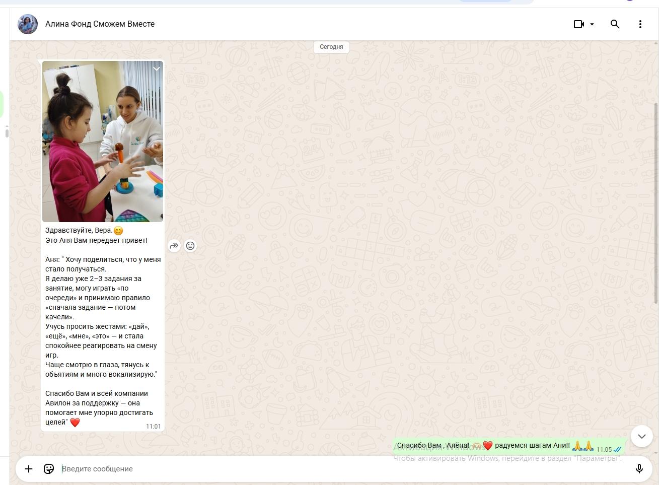 Мы невероятно гордимся прогрессом Ани и хотим поделиться этой радостью с вами! Каждый шаг вперёд — это победа, и мы верим, что впереди у неё ещё много удивительных достижений.